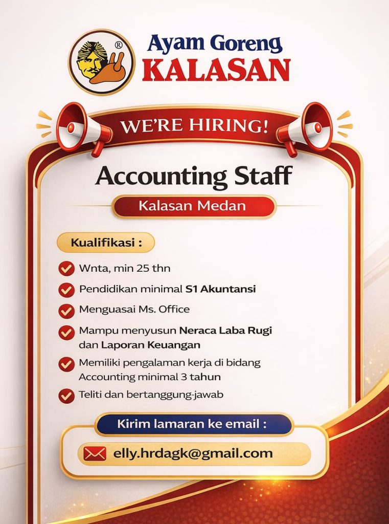 Accounting Staff Full Time Medan, Sumut Posted 11 hours ago Ayam Goreng Kalasan To apply for this job email your details to elly.hrdagk@gmail.com
