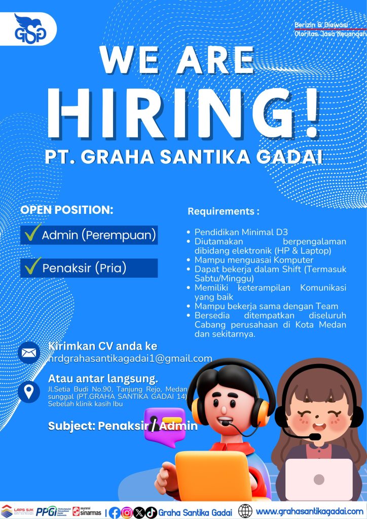 Admin & Penaksir Full Time Medan, Sumut Posted 2 hours ago PT Graha Santika Gadai To apply for this job email your details to hrdgrahasantikagadai1@gmail.com