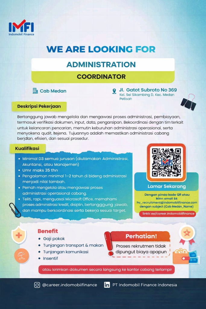 Administrator Coordinator Full Time Medan, Sumut Posted 18 hours ago Indomobil Finance To apply for this job email your details to Hr_recruitment@indomobilfinance.com