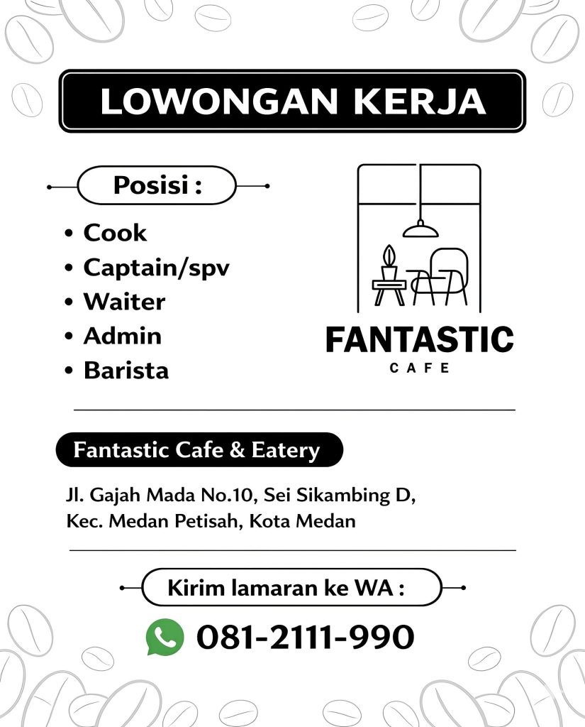 Cook, Captain, Waiter, Admin & Barista Full Time Medan, Sumut Posted 1 week ago Fantastic Cafe To apply for this job please visit wa.me.