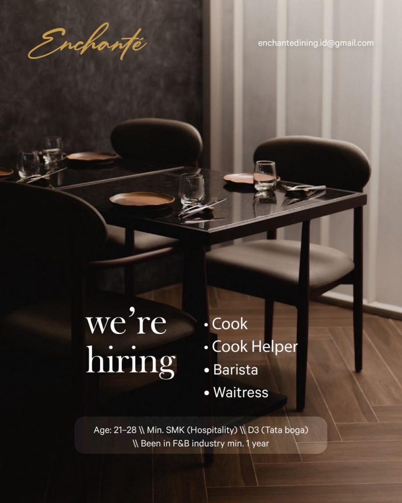 Cook, Cook Helper, Barista & Waitress Full Time Medan, Sumut Posted 11 hours ago ENCHANTE To apply for this job email your details to enchantedining.id@gmail.com