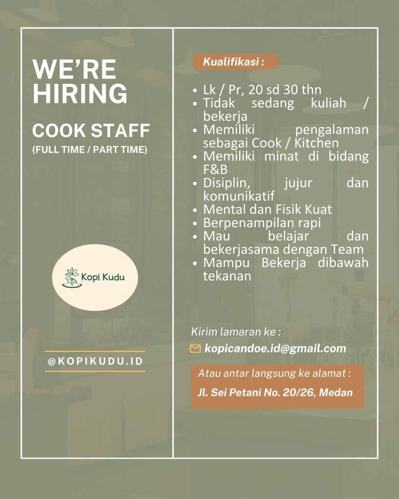 Cook Staff Full Time Part Time Medan, Sumut Posted 2 weeks ago KOPI KUDU To apply for this job email your details to kopicandoe.id@gmail.com