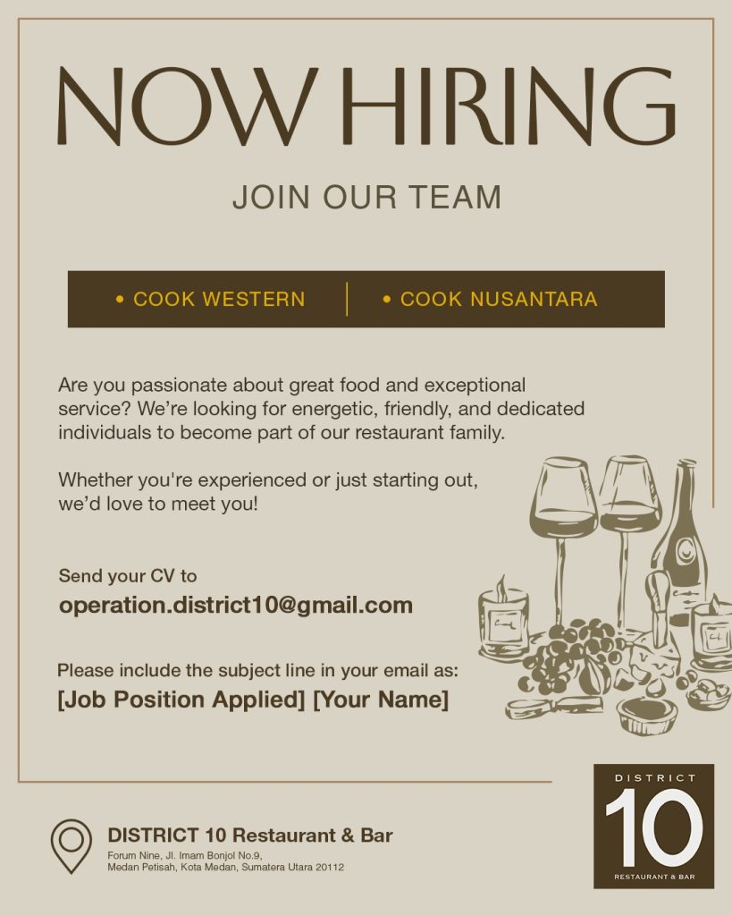 Cook Western & Cook Nusantara Full Time Medan, Sumut Posted 10 hours ago District 10 Restaurant & Bar To apply for this job email your details to operation.district10@gmail.com