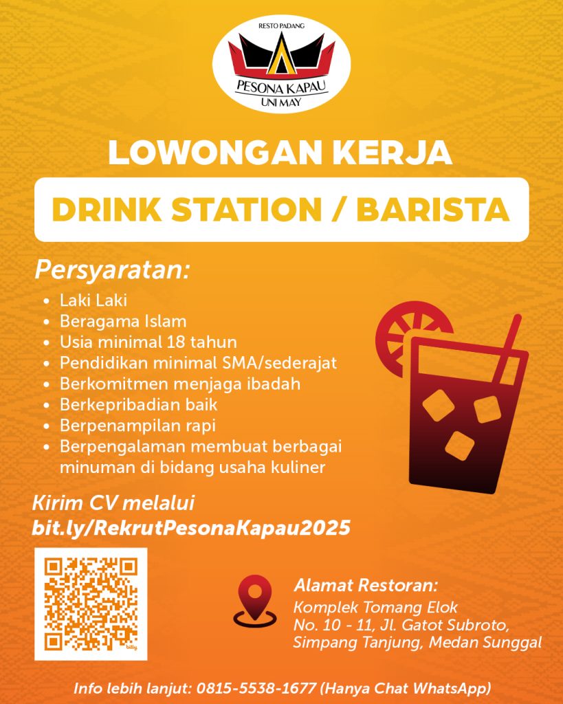 Drink Station / Barista Full Time Medan, Sumut Posted 1 week ago Pesona Kapau Uni May To apply for this job please visit bit.ly.