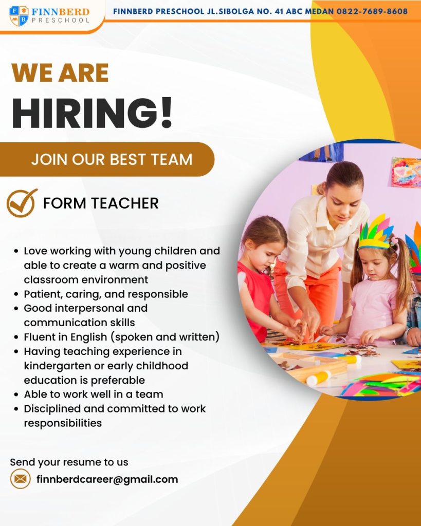 Form Teacher Full Time Medan, Sumut Posted 2 days ago Finnberd Preschool To apply for this job email your details to finnberdcareer@gmail.com