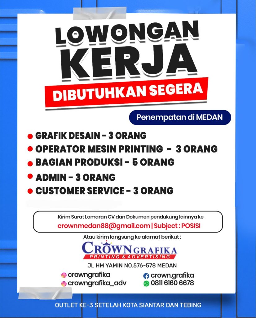 Graphic Design, Operator Mesin Printing, Bagian Produksi, Admin & Customer Service Full Time Medan, Sumut Posted 13 hours ago Crown Grafika To apply for this job email your details to crownmedan88@gmail.com