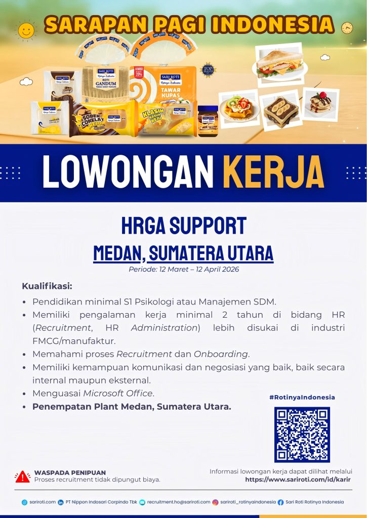 HRGA Plant Full Time Medan, Sumut Posted 16 hours ago PT Nippon Indosari Corpindo Tbk To apply for this job please visit hrsr.darwinbox.com.