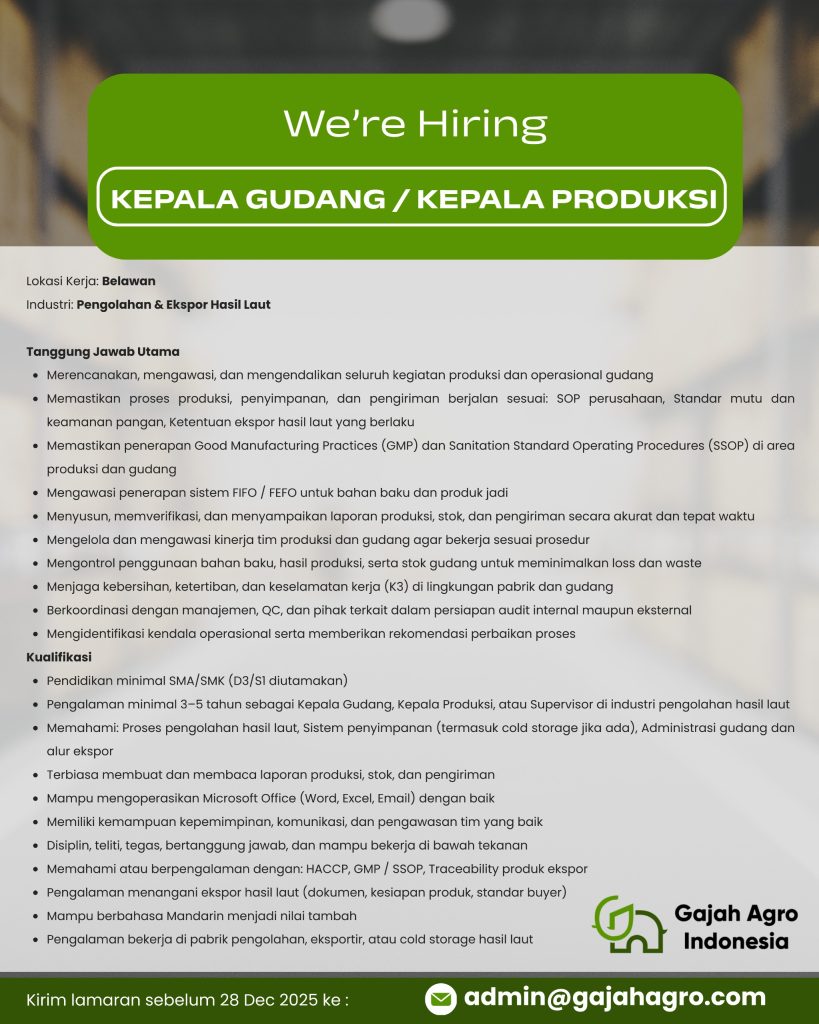 Kepala Gudang / Kepala Produksi Full Time Medan, Sumut Posted 2 weeks ago GAJAH AGRO INDONESIA To apply for this job email your details to admin@gajahagro.com