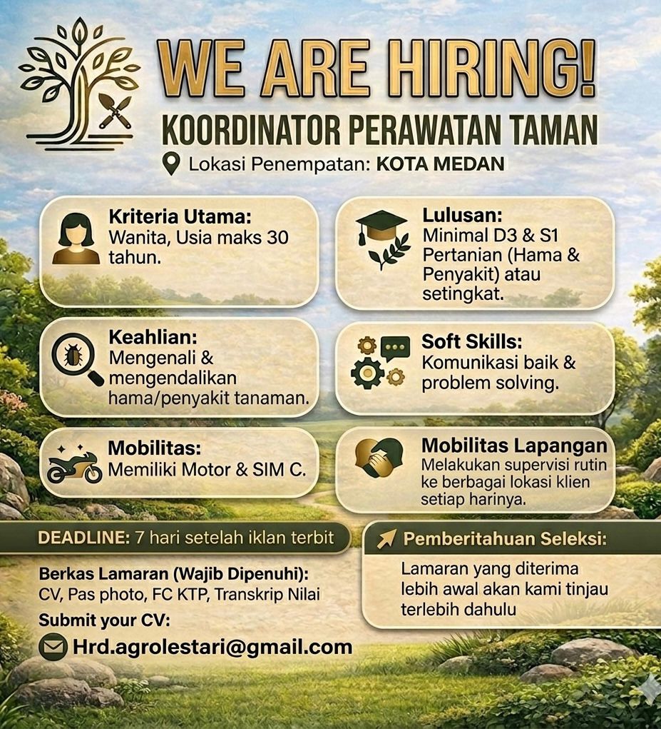 Koordinator Perawatan Taman Full Time Medan, Sumut Posted 1 day ago Greenery Solutions To apply for this job email your details to hrd.agrolestari@gmail.com