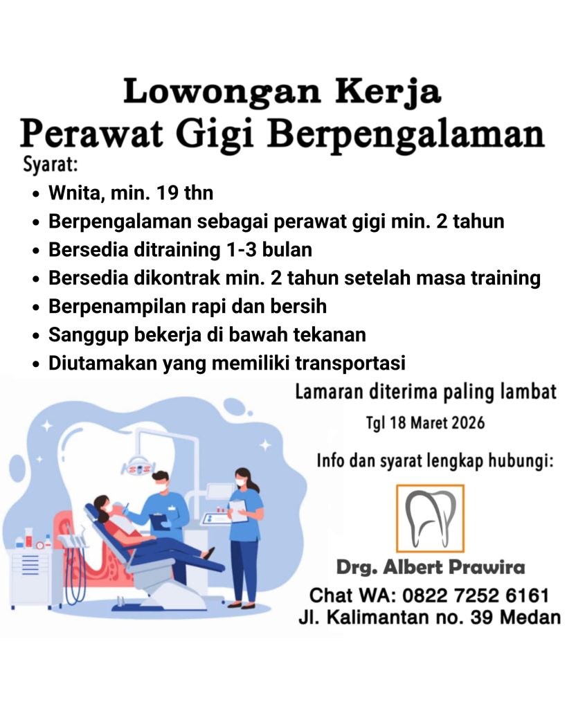 Perawat Gigi Full Time Medan, Sumut Posted 18 hours ago Drg. Albert Prawira To apply for this job please visit wa.me.