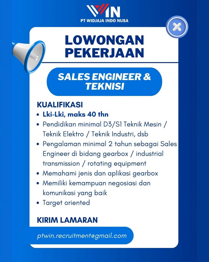Sales Engineer & Teknisi Full Time Medan, Sumut Posted 18 hours ago PT Widjaja Indo Nusa To apply for this job email your details to ptwin.recruitment@gmail.com