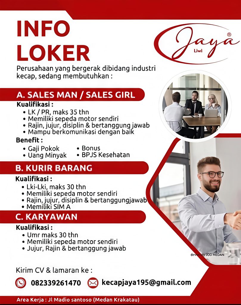 Sales Man / Sales Girl, Kurir Barang, Karyawan Full Time Medan, Sumut Posted 2 weeks ago Jaya Liwi To apply for this job email your details to kecapjaya195@gmail.com