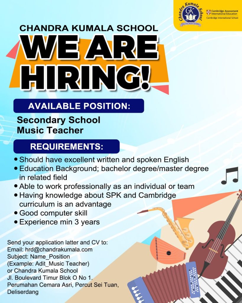 Secondary School Music Teacher Full Time Medan, Sumut Posted 1 week ago Chandra Kumala School To apply for this job email your details to hrd@chandrakumala.com