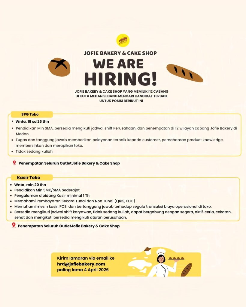SPG Toko & Kasir Toko Full Time Medan, Sumut Posted 12 hours ago Jofie Bakery & Cake Shop To apply for this job email your details to hrd@jofiebakery.com