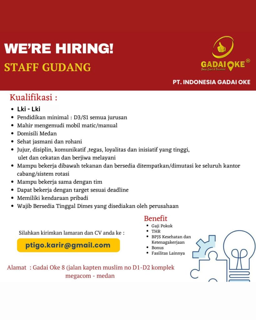 Staff Gudang Full Time Medan, Sumut Posted 17 hours ago PT Indonesia Gadai Oke To apply for this job email your details to ptigo.karir@gmail.com
