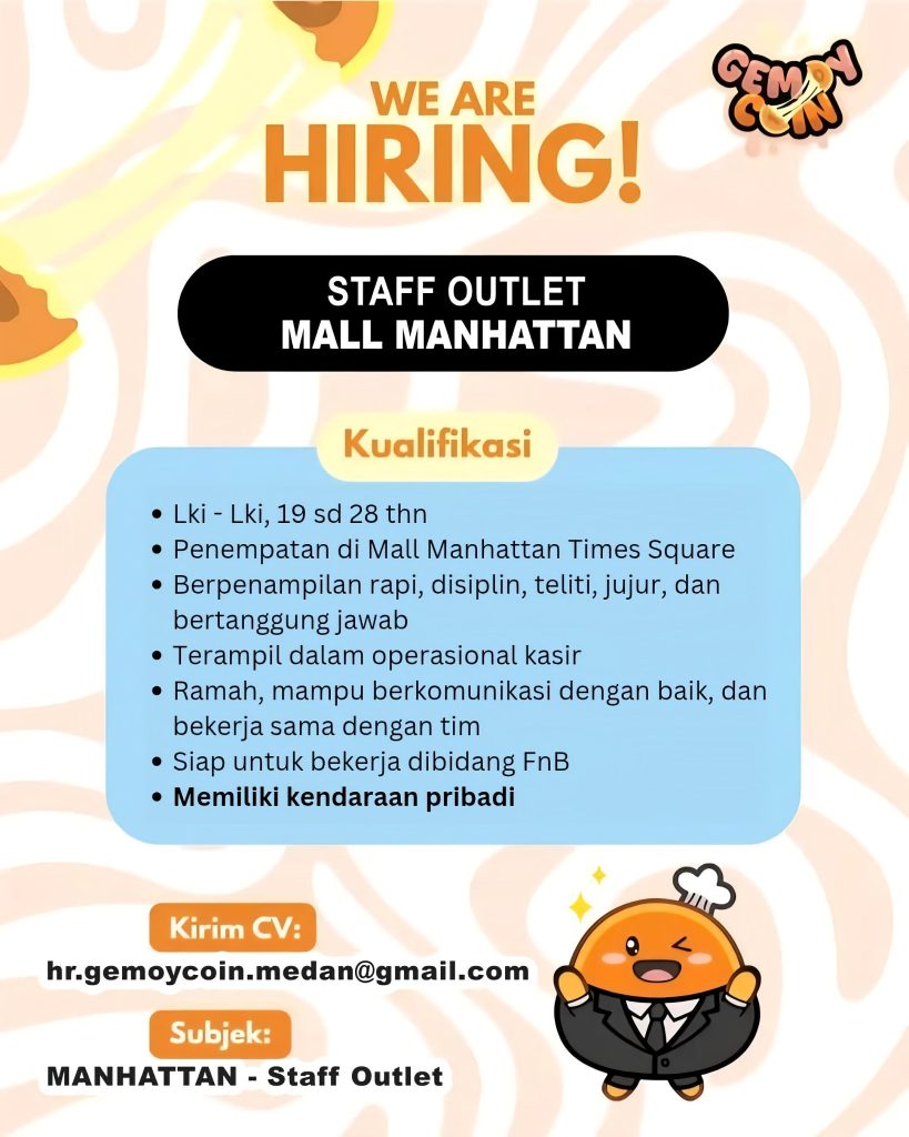 Staff Outlet Full Time Medan, Sumut Posted 18 hours ago Gemoy Coin To apply for this job email your details to hr.gemoycoin.medan@gmail.com