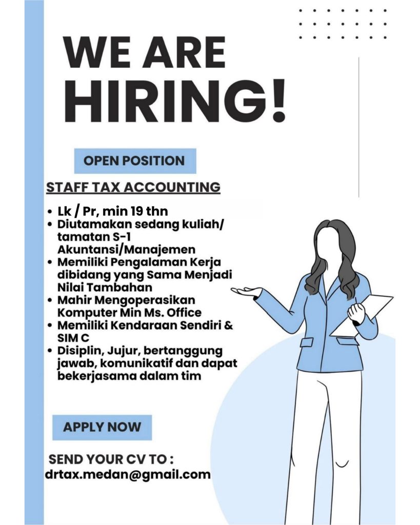 Staff Tax Accounting Full Time Medan, Sumut Posted 2 weeks ago Private To apply for this job email your details to drtax.medan@gmail.com
