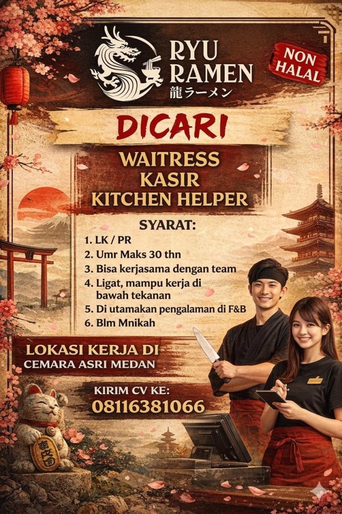 Waitress, Kasir & Kitchen Helper Full Time Medan, Sumut Posted 14 hours ago Ryu Ramen To apply for this job please visit wa.me.