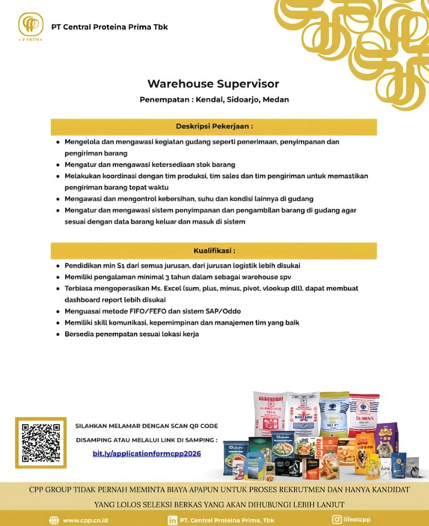 Warehouse Supervisor Full Time Medan, Sumut Posted 6 days ago PT Central Proteina Prima Tbk To apply for this job please visit Bit.ly.